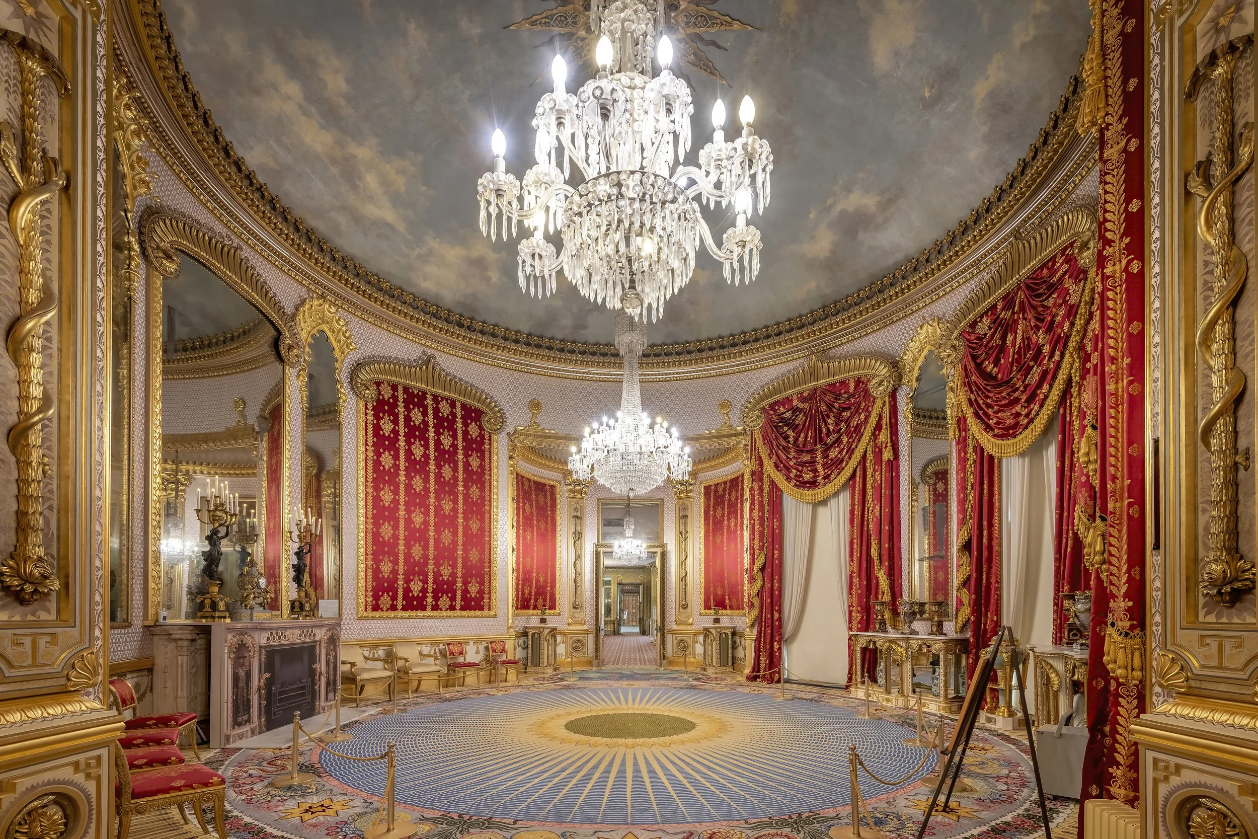 The interior of the hall is very opulent and you enter through the Marble Hall, which is made of pink Derbyshire alabaster, this leads on to the first floor and the state rooms. The most impressive of these rooms is the Saloon, which has walls lined with red velvet. Each of the major state rooms is symmetrical in its layout and design and in some rooms, false doors are necessary to fully achieve this balanced effect.